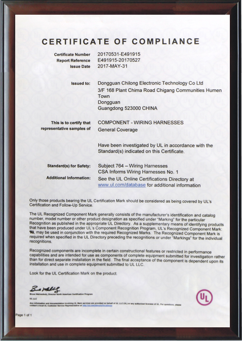 公司通過并擁有電線之UL安規認證,電線加工之UL認證,質量管理體系之ISO9001認證。
